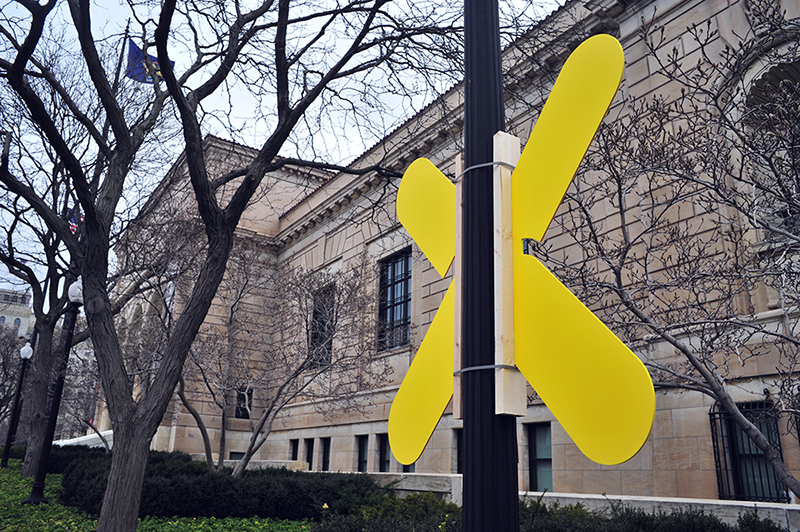 We devised multiple ways for the public to encounter and interact with the brand of the yellow X, both on the street and online. We placed large plastic X’s on light posts, adhered them to windows and put them on the stairs at the Majestic Theatre. We also placed row upon row of smaller yellow X’s on pre-approved lawns. Each of the smaller X’s had a ‘Take Me’ sticker on it along with a QR code. Digital animations of the X logo were designed, programmed and then projected onto two major buildings in the area and later used as part of an online digital campaign.