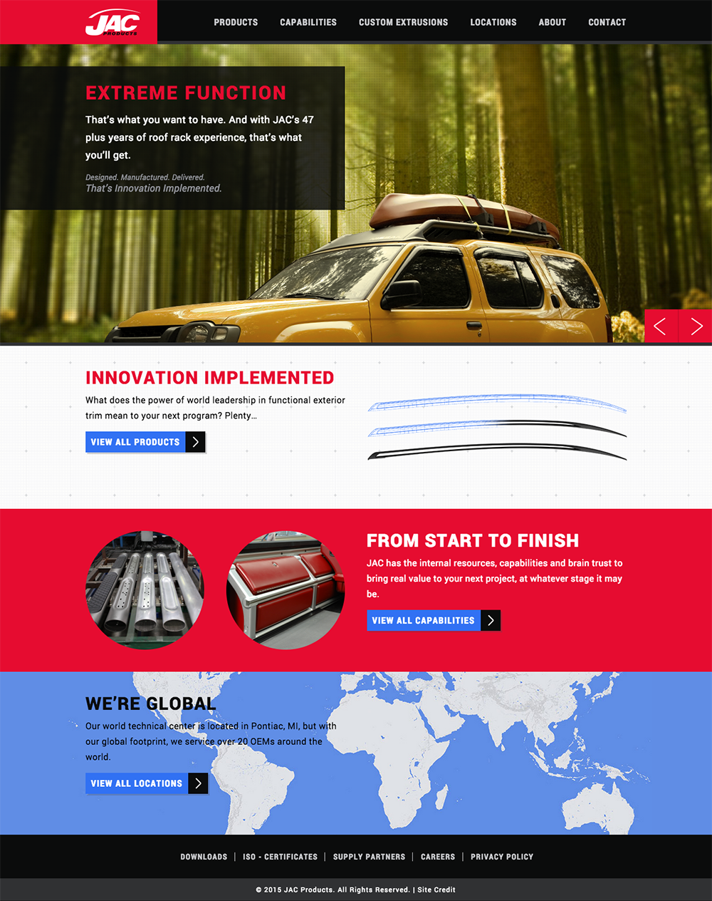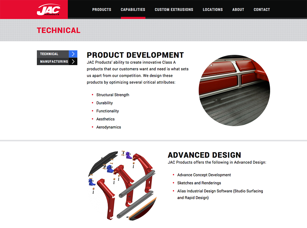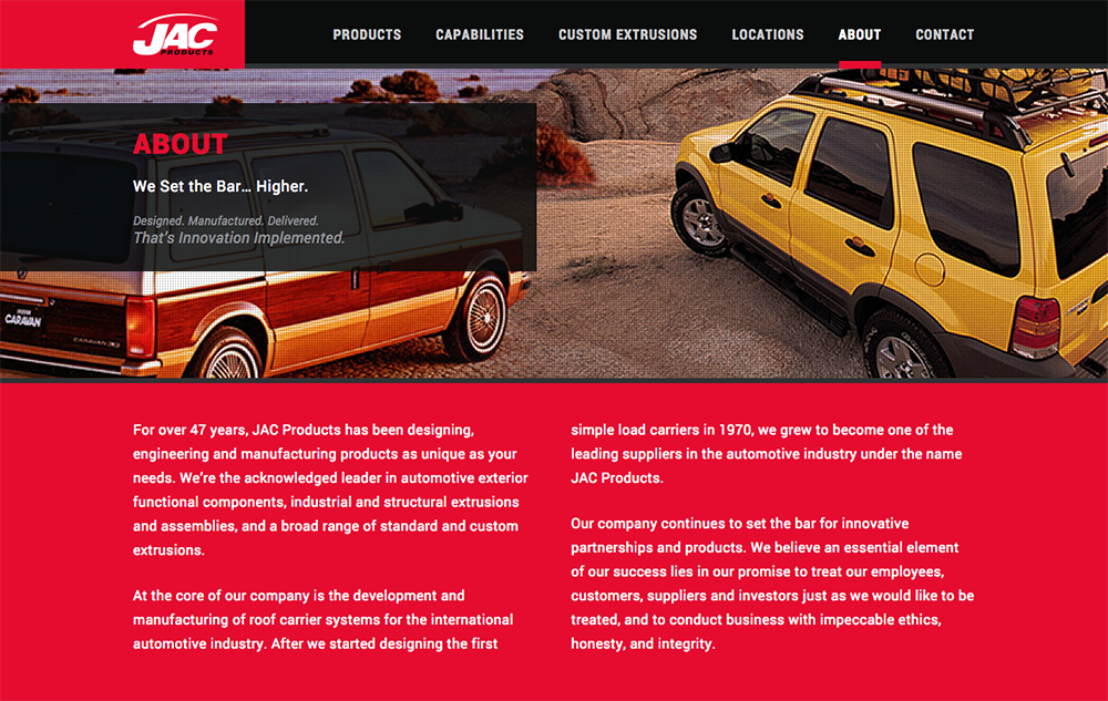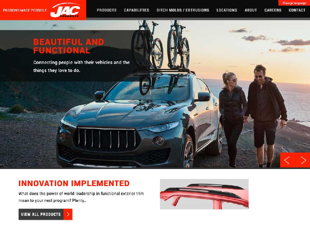 JAC Products is a global corporation that designs and manufactures roof racks, step rails, side rails and cargo management systems for the OEM's. They were in need of a new website to strengthen their web presence which entailed a complete rebranding and overhaul. They wanted to increase their client base and their current brand and website were as doing the company a disservice and like many brands, they were dated. The high quality and innovation that they provided was not represented or communicated. The scope of their global footprint that their corporation encompassed was hidden. They also wanted to feature their products and capabilities with less text and as few clicks as possible.