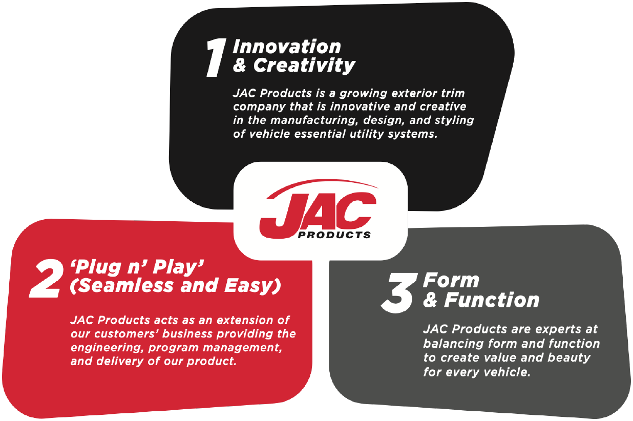 JAC Products is a 55-year-old global manufacturing corporation that designs and manufactures roof racks, step rails, side rails and cargo management systems for the OEM's (Original Equipment Manufacturers).